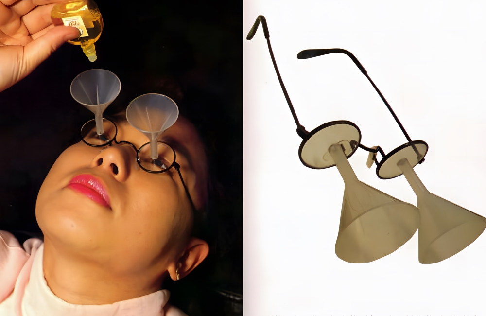 You put the medication into the funnel, keep your eye open, and it goes right into your eye without a problem. The glasses are made by Topcon, located in Tokyo, Japan. According to the U.S. Patent Office, these eyedrop glasses were first patented in 1991.