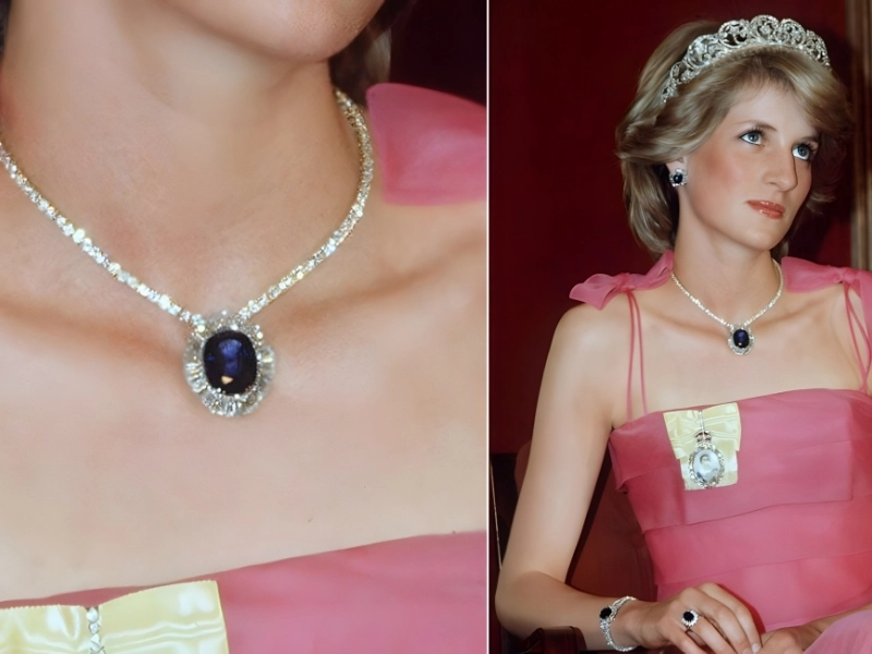 Among all the pieces, the enormous diamond-set Burmese sapphire necklace with a slender diamond chain to match was maybe the most well-known. Diana donned the exquisite set multiple times, and the People’s Princess may be seen wearing one of the pieces in many of her most well-known pictures, which are housed in the Carlyle Group’s Getty collection.