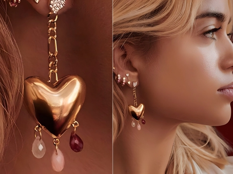 The 18-carat gold-plated vermeil earrings, which draw inspiration from Romeo and Juliet, are adorned with rubies, pink opals, rose quartz, and white topaz. Even if they aren’t made of platinum and diamonds, each pair costs $285.