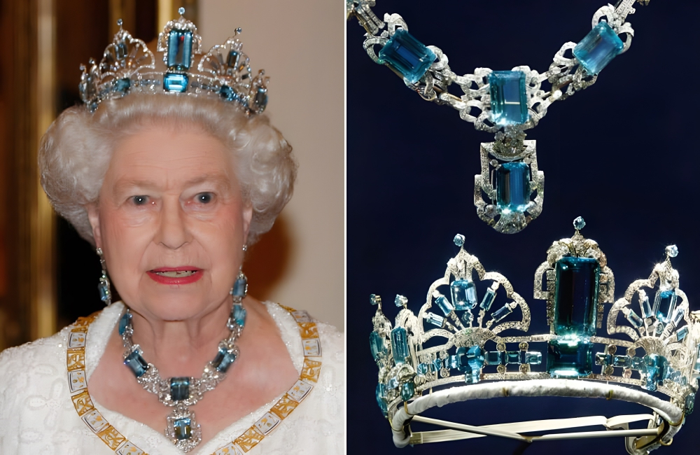 Brazilian Aquamarine Parure Tiara, Earrings, and Necklace Queen Elizabeth II ©WPA Pool / Gettyimages.com | @Kindi Scartaccini / Pinterest