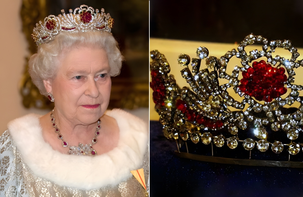 The Burmese Ruby Tiara is quite unique for multiple reasons. It’s one of the more modern pieces of jewelry owned by Queen Elizabeth II as she commissioned it in the early ‘70s. Made by Garrard, the breathtaking diadem contains 96 rubies gifted to the Queen by the Burmese people.