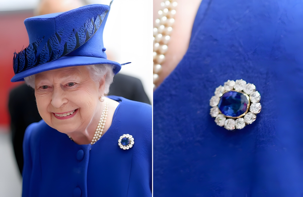 Her Majesty is partial to matching her jewelry to her outfits, so this stunning sapphire can often be seen when Elizabeth is dressed up to the nines in blue. Fashions may have changed over the years, but Liz’s love of coordination has never waned.