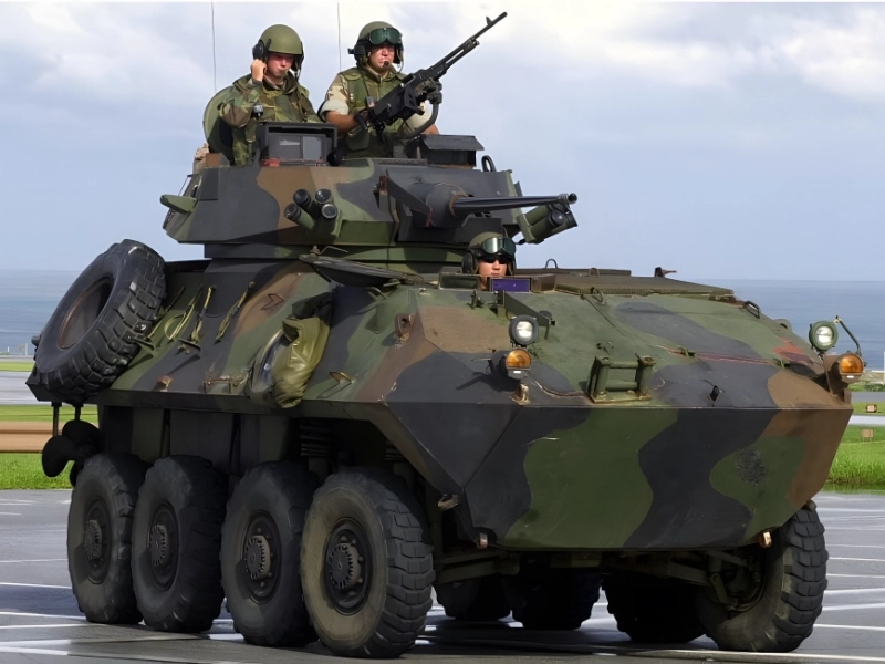 The General Dynamics-built LAV-25 was used in battle in 1989. This is a reconnaissance vehicle with eight wheels and welded steel armor. The M242 Bushmaster chain gun, which has 210 rounds of ammo, is its primary weaponry. It has two M240 machine guns with 660 rounds of ammunition as supplementary armament.