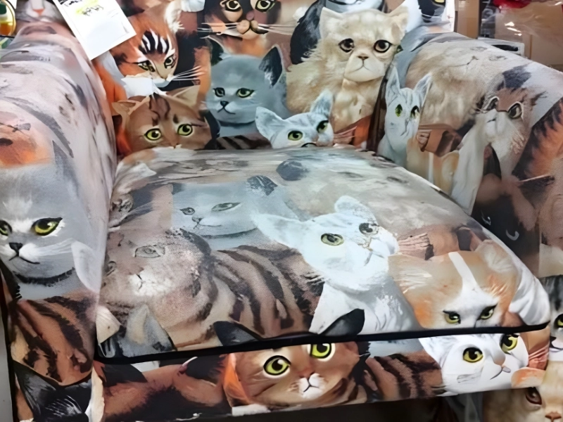 Sofa @frequencity, Imgur.com, or Cat Loves A large chain store wouldn’t take up an armchair with a bunch of wide-eyed cats peering out at customers; this one needs to have been reupholstered. Anyone daring enough to buy it might score this unique cat armchair for less than $15 at Goodwill.