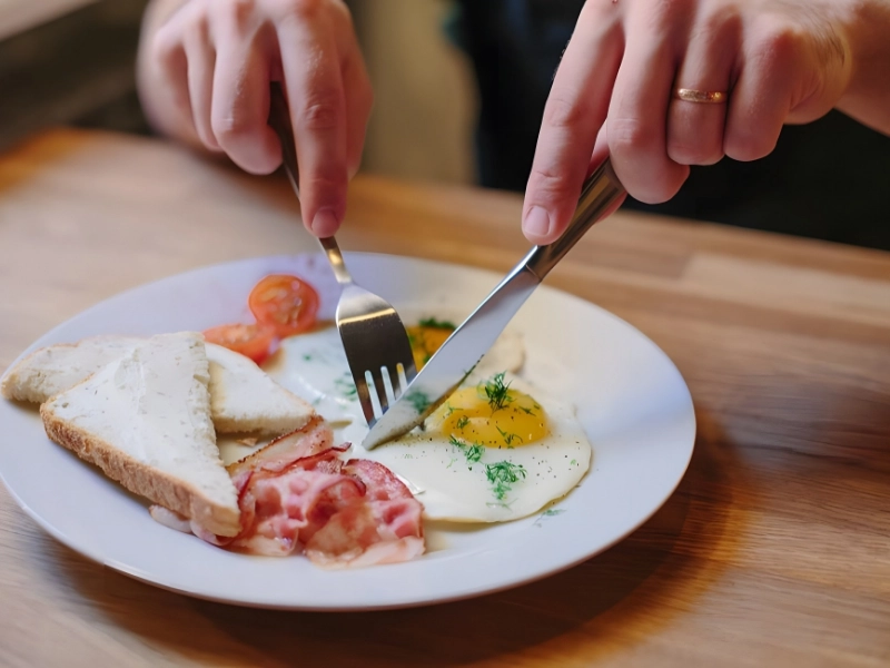 The Royal holds the knife in his right hand and the fork in his left, the tines facing down. The Royals balance their food on the back of their forks and then bring it to their mouths, as opposed to stabbing at it.