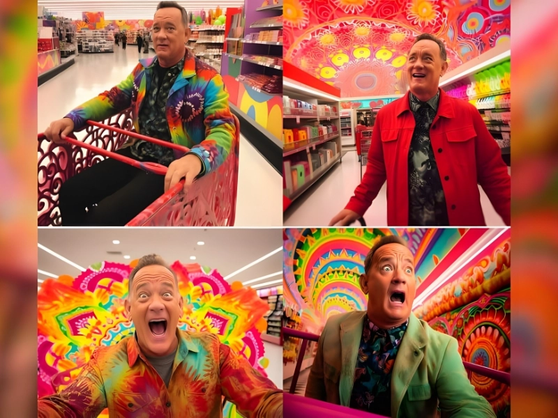 Obwohl es ein wenig beunruhigend ist, Amerikas Vater beim Säurekonsum zuzusehen, macht diese KI-Serie es realistisch. Auf diesen Bildern begibt sich Hanks nicht nur auf einen LSD-Trip, sondern auch auf einen LSD-Trip – ausgerechnet bei Target.
