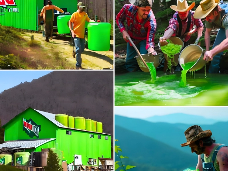 Hier sammelt eine Gruppe von Arbeitern in Tennessee den „Tau“ der Berge und transportiert ihn zu einer Fabrik. Wenn der Tau nicht diese bedrohliche Neonfarbe hätte (wie das Original), wäre er gesund.
