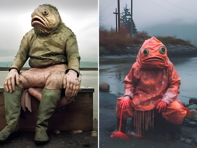 „Fishermen“ ist in dieser beunruhigenden, erschreckenden KI-Bilderserie zu sehen. Die Fischer sind in diesem Fall nicht das, was man erwarten würde; Stattdessen handelt es sich um Fisch-Menschen-Hybriden, die sich deprimiert vor dem kühlen, bedeckten See abheben. Vielleicht sind das die Folgen der Entsorgung radioaktiven Mülls.