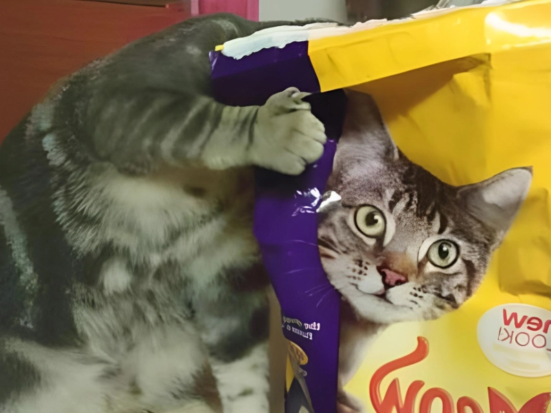 With his red-handed (or should I say red-pawed?) attempts to break into a bag of mouthwatering Meow Mix, the culprit in this case is very obvious. It appears as though the cat is the model for the bag due to an optical illusion.