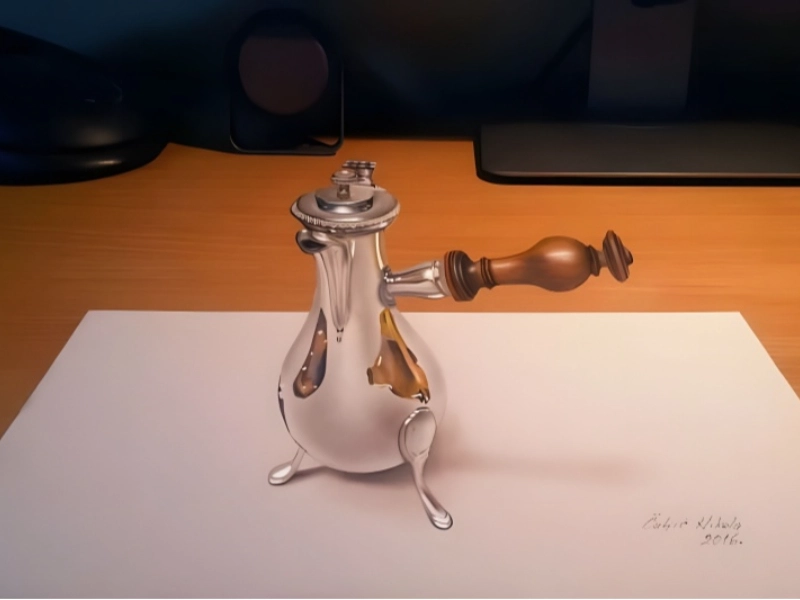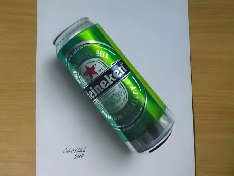 This masterwork of hyperrealistic painting exhibits an amazing degree of technical ability and attention to detail. The artist has produced such a convincing illusion that spectators could actually imagine someone placed their beer bottle on a drawing paper washes-through. With painstaking attention to the reflections, refractions, and subtle colour variances that make glass such a difficult material to represent, the glass bottle is especially remarkably rendered. Carefully arranged to accentuate the feeling of dampness and chilly temperature, the condensation droplets on the surface of the bottle provide still another level of realism. The shadow work, which produces the striking illusion of someone standing above the scene photographing, is maybe most remarkable. This little aspect gives the work an interactive component that lets viewers feel as though they are part of the scene being caught. Complementing the three-dimensional character of the artwork, the texture of the paper under the bottle—complete with minute wrinkles and tone variations—helps to highlight this.