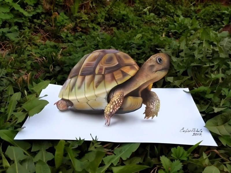 With such exquisite realism, this amazing painting catches the core of a tortoise and seems to be gently travelling off the page. From the complex shell plate patterns to the textured scales on the tortoise’s legs and head, the artist’s technical ability is clear in every element. The deft arrangement indicates movement, giving the impression that this two-dimensional production is trying to break free from its paper restrictions. While the accurate portrayal of the turtle’s skin texture and the minute changes in colour show an extraordinary awareness of light and shadow, the lighthearted reference to the famous legend of the tortoise and the hare gives the work some humour. The painting gains life and personality from the way the artist has caught the creature’s determined attitude and distinctive slow-motion movement. Viewers may find themselves wanting to reach out and touch the tortoise’s shell to verify it’s truly only a drawing because of the three-dimensional impact.