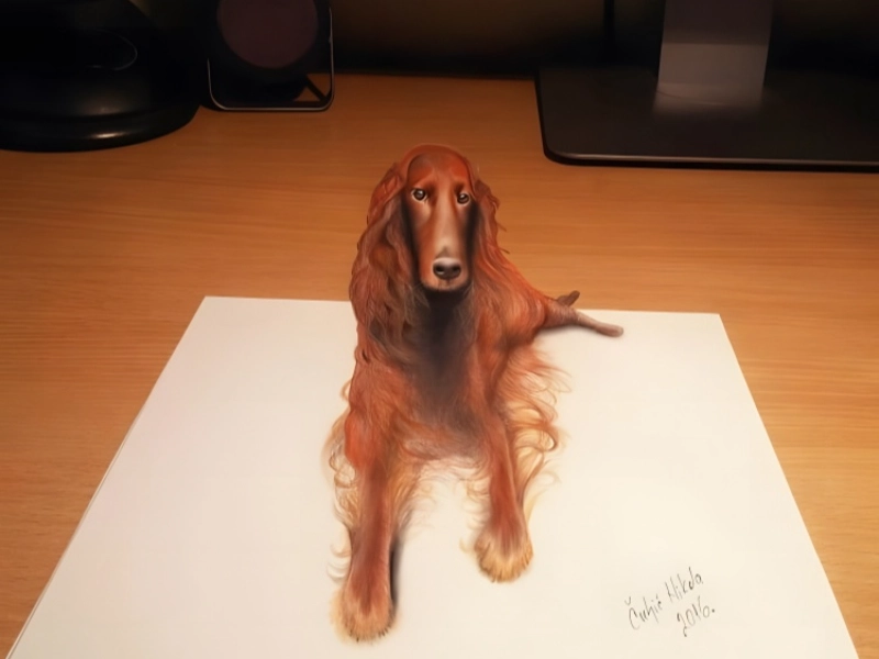 This lovely picture shows another great performance of man’s best friend, this time emphasising on a dog with especially amazing fur. The artist’s technical mastery is clear in the great precision given to every strand of hair, producing a luscious, flowing look that seems to catch movement even in stillness. The texture work is really remarkable; just as in a real dog, distinct patches of fur are portrayed with differing degrees of thickness and direction. While the posture suggests an attentive and interesting personality, the emotion caught in the animal’s eyes speaks a profound intelligence that connects with viewers right away. Particularly remarkable are the lighting effects on the fur, which provide depth and texture by means of subdued highlights and shadows, therefore rendering the dog nearly tactile. The artist has caught not only the outside look but also the natural appeal that makes dogs such cherished friends.