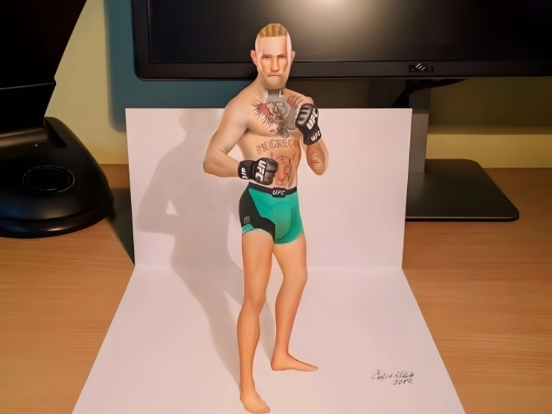 UFC champion Conor McGregor’s dynamic portrait shows the artist’s extraordinary capacity to capture both physical resemblance and personal magnetism. From his unique facial characteristics to his confident posture, the picture remarkably faithfully captures the fighter’s unmistakable intensity. While portraying the muscular definition that testifies to McGregor’s athletic ability, the artist has deftly reproduced his well-known tattoos, each one exactly detailed and correctly positioned. His eyes’ ferocious appearance, facial hair, and minute skin texture all help to make a quite lifelike portrayal. Suggesting both power and accuracy, the posture selected for the artwork exactly captures McGregor’s renowned fighting style and theatrics. Strong three-dimensionalism produced by the shading and highlighting techniques gives the artwork the impression of being ready to walk off the page and into the octagon.
