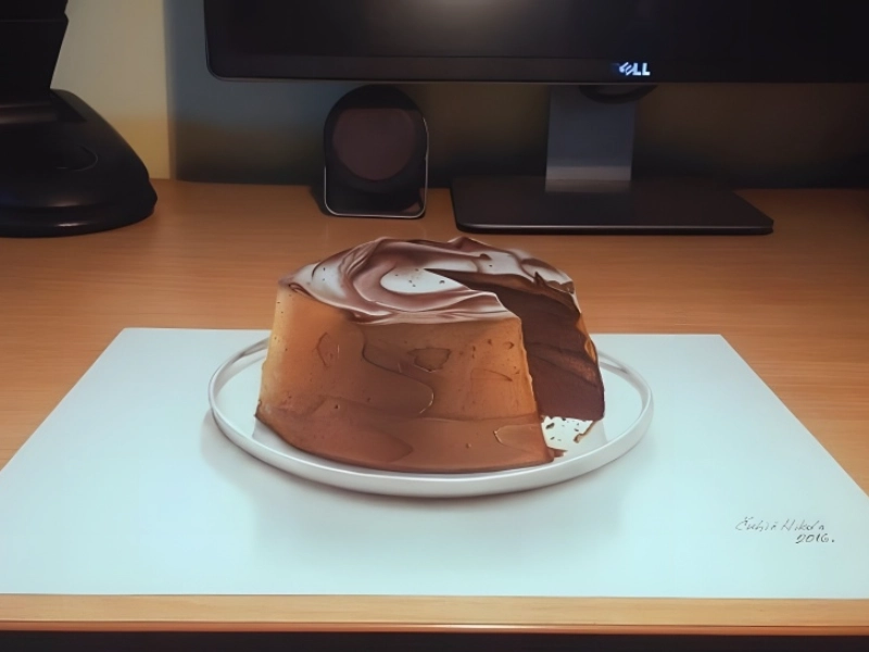 This delicious picture of a chocolate cake shows amazing ability in capturing both texture and composition. The artist has produced such a lifelike portrayal that the missing slice seems to have been plucked from a real cake literally. From the rich, moist cake texture to the silky, glossy icing that seems to catch the light just precisely, the layers’ exceptional attention to detail The missing piece’s revealed cross-section exhibits amazing technical ability in capturing the several textures and layers of a luxury chocolate cake. Particularly in the way the frosting seemed to have been laid with great accuracy, the artist’s mastery of shadow and brightness produces a real feeling of depth. While the general composition depicts a moment frozen in time, as if someone has just slipped away with their final slice, the minute crumbs around the sliced area contribute to the reality. The deep, dark tones of the chocolate have been expertly reproduced so that viewers can find themselves yearning a bit of their own.