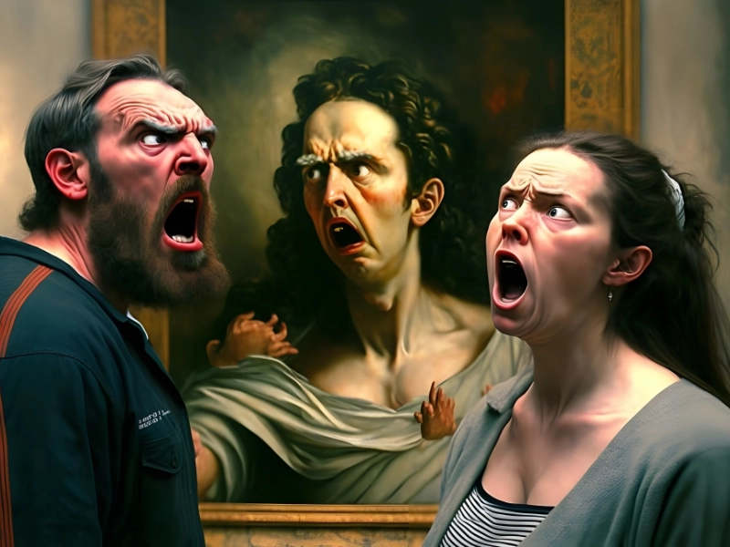 This AI artwork, which may have been made with Midjourney, shows two people around an art museum where everyone seems to be shouting and upset. The married couple onscreen are furious with one another (albeit they aren’t looking at each other).
