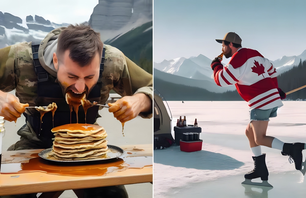 Another thing Canadians love? Maple syrup, straight from the tree to the breakfast aisle of Walmart. This picture combines both concepts, showcasing a deranged Canadian camper going to absolute town on this stack of pancakes, as well as an overenthusiastic ice skater in short shorts.