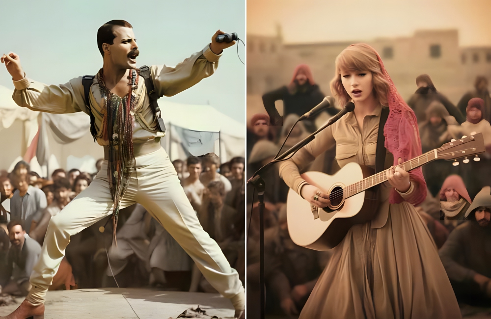 Freddie Mercury and Taylor Swift would take center stage at Kandachella in 1923, according to this AI series by Ritchie Wijaya. This music fest is taking place in Kanda, India, hence the outfits and general vibe of the photo.