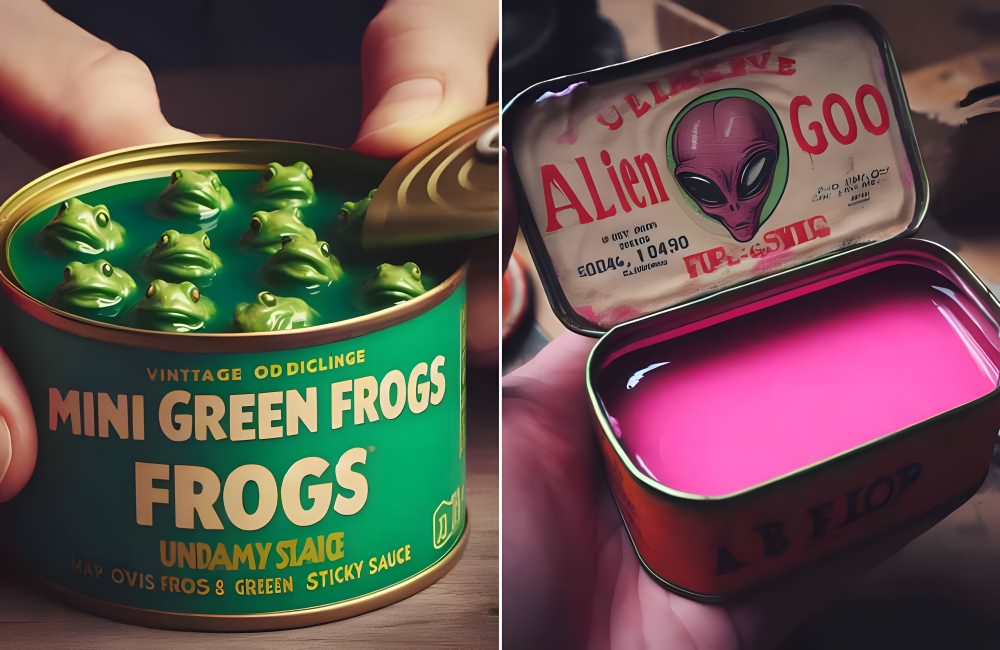 Alien Goo and Mini Green Frogs—two canned foods we can expect to see on the shelves never. This AI project took the idea of weird, vintage canned food and took it to an entirely bizarre, new level (as AI is wont to do).