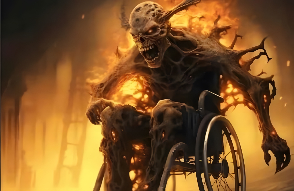 Sounds terrifying, right? But what’s not terrifying is Midjourney taking that concept and turning it into a literally paraplegic demon. While the demon is scary-looking, the wheelchair looks like it was bought from a regular old medical supply company, which takes the edge off the image.
