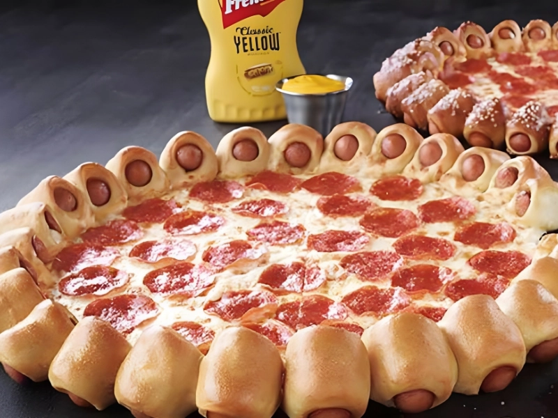 Pizza Hut has very limited restrictions on what can be placed on or inside of its crust; hotdog pizza is just one more example of this. In 2015, the Hotdog Pizza was launched to commemorate the 10th anniversary of the cheese-filled Stuffed Crust. Pizza encircled with twenty-eight hotdogs is known as hotdog pizza.