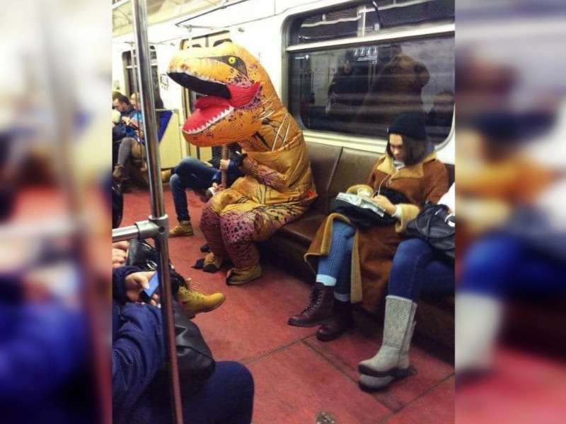 evidence showing some dinosaurs still exist rather than all extinct This scene catches what looks to be a dinosaur-themed interaction on the train in an amazing moment bridging prehistoric and current public transit. This scenario introduces the old culture into our current transportation system whether through complex attire, artistic design, or unanticipated passenger behaviour. Something archaic placed in the modern environment of a subway car produces a wonderfully ridiculous scenario that fascinates and laughs out fellow passengers. This odd sight reminds us that public transit sometimes provides a stage for the most unanticipated meetings where the boundaries between fact and fiction can blur in the most interesting ways. Having this “surviving dinosaur” makes every everyday trip an experience deserving of Jurassic Park.