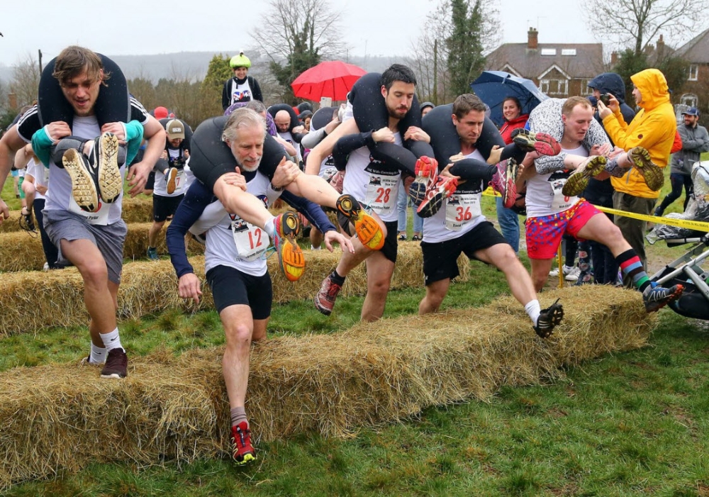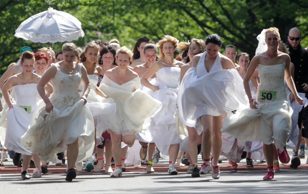 An annual charity race featuring women in wedding dresses. The winner is the one who is the first to overcome the obstacle course in this outfit.