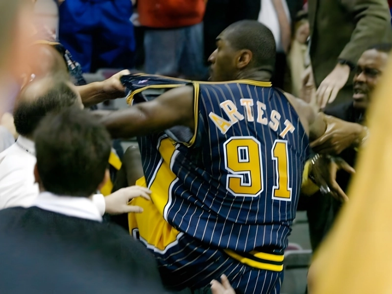 An on-court altercation between Ron Artest and Ben Wallace (of the rival Detroit Pistons) resulted in Artest storming into the seats to fight a fan, making it one of the most notorious moments in basketball history. During the initial altercation, a fan accidentally spilled his beer on Artest.