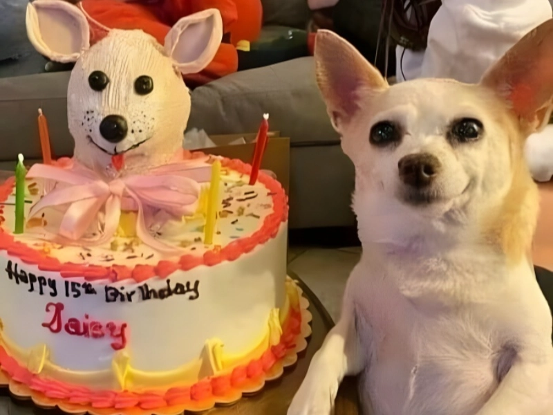 First of all, props to whoever made this cake—a masterwork of canine celebration. The birthday girl, Daisy, seems to be savouring her unique moment with an extremely contagious energy. Her posture in front of her birthday cake, apparently smiling and deliberately posing for the picture, shows just how well she knows this celebration—all about her. For any dog, reaching 15 years is an amazing accomplishment, hence this celebration especially marks Daisy and her devoted family.