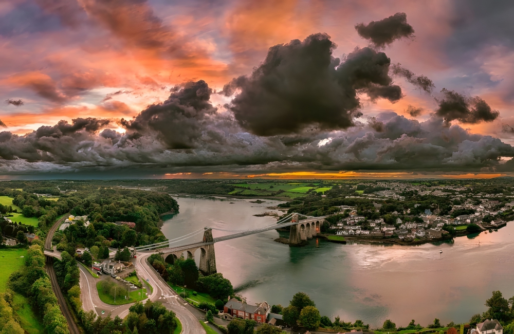 The Menai Strait is a stretch of tidal water that separates Anglesey from Wales. Found in the Irish Sea, the water is just eighteen inches high at low tide, which has made the Strait a notoriously dangerous location for ferries to cross. The main source of beauty in this image is the Sky, as the clouds are fairy-tale-like.