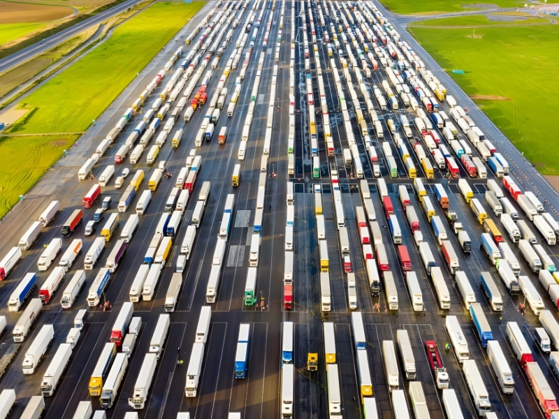 The image also emphasizes how significant the haulage sector is to the UK. The RHA estimates that the industry contributes approximately $150 billion to the UK economy. In the UK, there are about 493,600 registered hauling trucks that weigh more than 3.5 tons. Only a portion of that entire number is shown in this photo.
