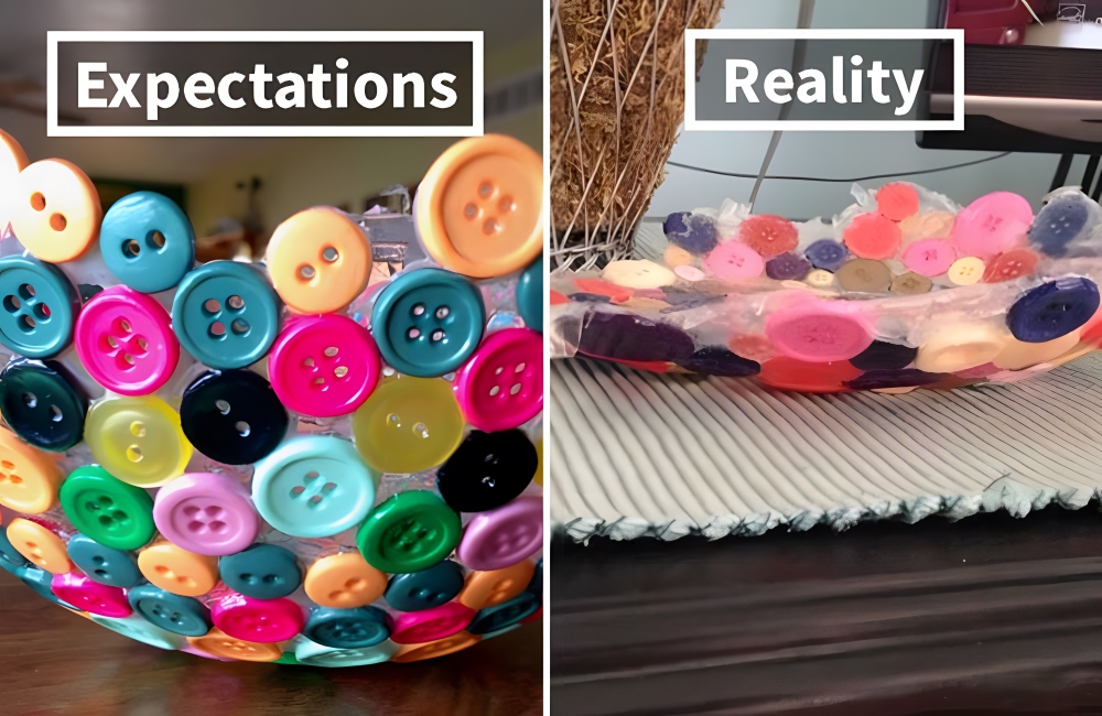 The second half looks like glue, mixed with buttons, formed into a saggy plate. According to Pinterest, you have to fashion the glue into a bowl shape before attempting to stick buttons on it. Though this really does look like a DIY project, it’s clear that only a few people have managed to make it work.
