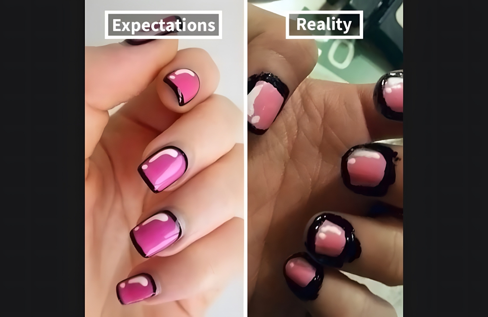 To be fair, even the nail art on the left wasn’t that great, so the starting point was pretty low. On the left looks like a manicure that has grown out a couple weeks (hence the centimeter of old nail and cuticle you can see). On the right is clearly a new manicure that looks even worse.