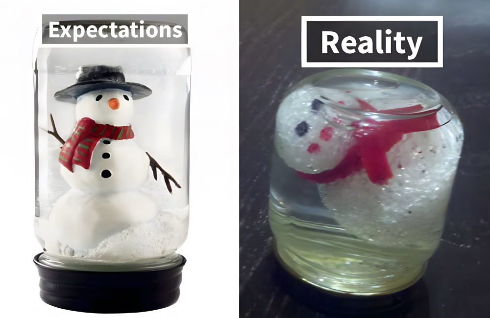 The proposed snow globe that this DIY project was designed to copy looks like a fun, winter decoration, seemingly made of viscous liquid, a jar, and a homemade snowman with a red scarf. The end result of one person’s attempt to copy the snow globe looks like Ghostbusters’ Stay Puft Marshmallow Man trapped in glue to keep it from escaping.