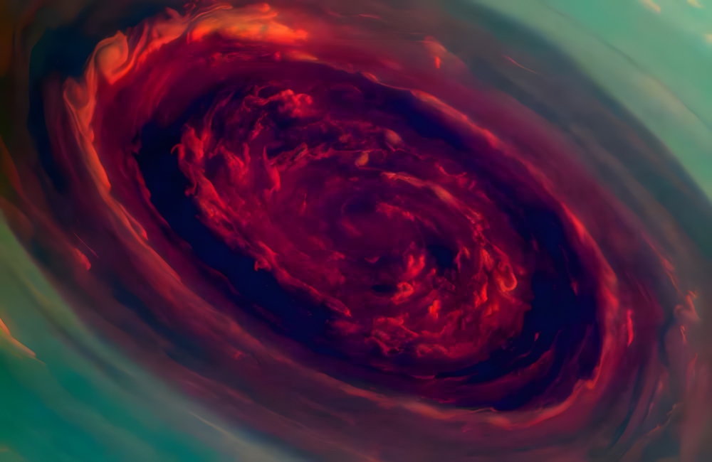 The hurricane is located atop the north pole of Saturn, the planet with the biggest storms in the solar system. Known as the Great Red Spot, this storm is a “megastorm,” a rare event that occurs every few decades and showers the planet in ammonia.