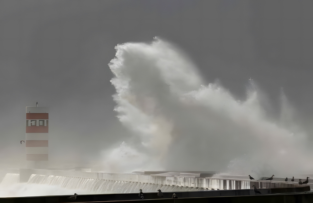 The birds in this photo look pretty unphased and nonchalant, an emotion we would not be sharing if we were there. This photo features a pier in the midst of a heavy storm, with waves crashing over it before sliding back into the sea.