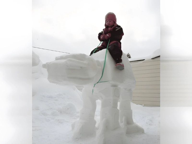 This deft retelling of an Imperial AT-AT Walker from Star Wars shows a remarkable grasp of both technical ideas and snow sculpture methods. From the precisely sized mechanical legs to the unique head design that aptly reflects the terrifying look of these legendary war machines, this work exhibits amazing attention to detail. The structural stability that lets it support human weight suggests meticulous study of snow compression and internal support systems as it is the most amazing technical accomplishment. The magnitude of the work makes it quite striking, much like its film inspiration; the creators showed extraordinary ability in preserving the geometric accuracy necessary to replicate this mechanical monster. This masterpiece is not only a sculpture but also an immersive piece of Star Wars fantasy brought to life in someone’s front garden since the environment itself, with its covering of white snow, exactly replics the atmosphere of the ice planet Hoth.
