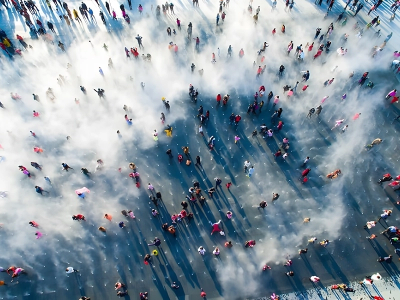 This image belongs to SkyPixel and won a prize in one of their competition categories in 2016. Known as “Cool City,” it showed crowds of people skating and standing around in a wintry winter scene. This picture had the caption, “City cool…people play amid the fountains.”