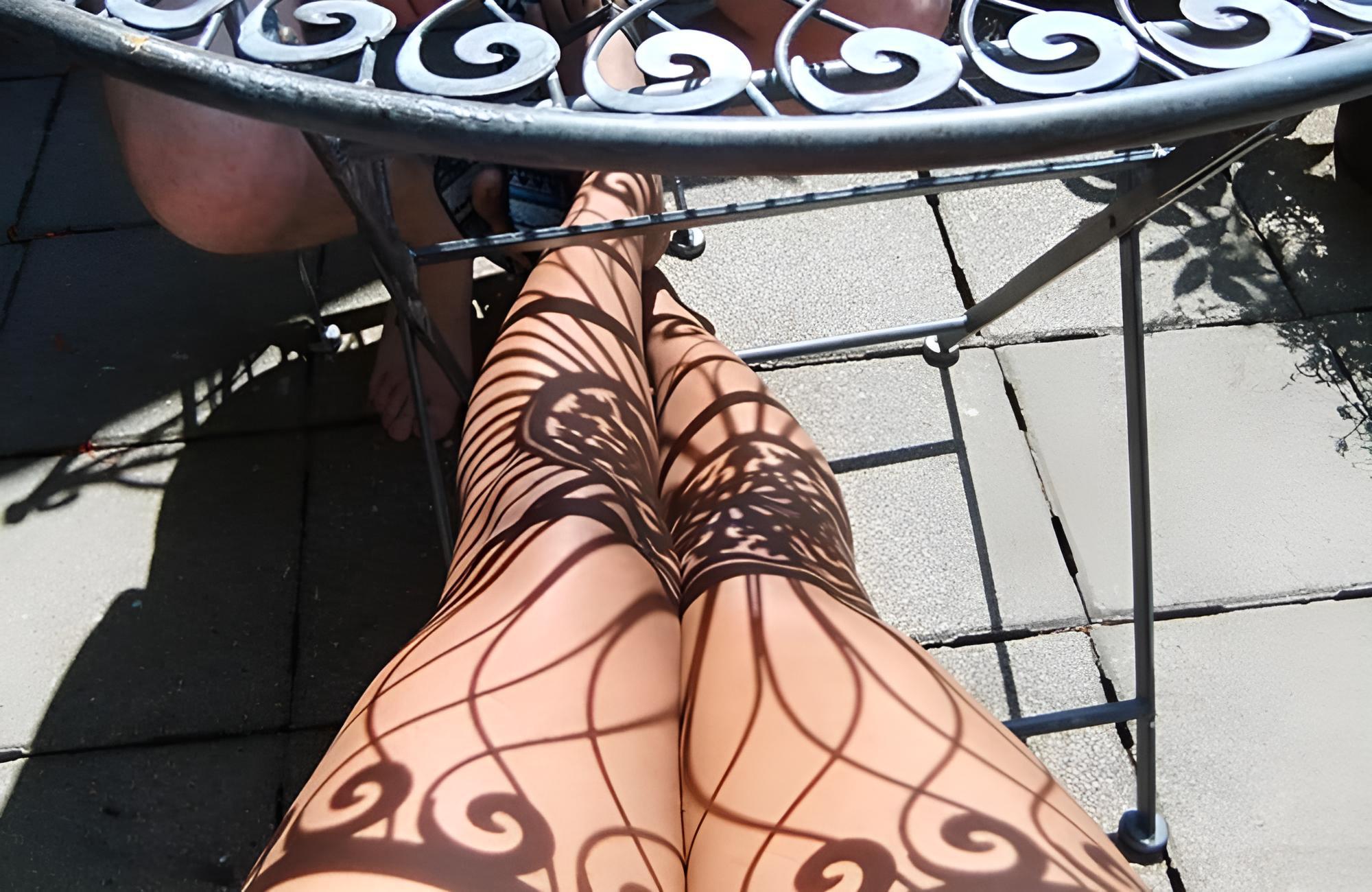 This woman found the perfect solution to look like she was wearing mesh-net stockings when the reflection of the intricate table before her fell onto her legs. The result was a knotty pattern, perfect for a day out if it was real.