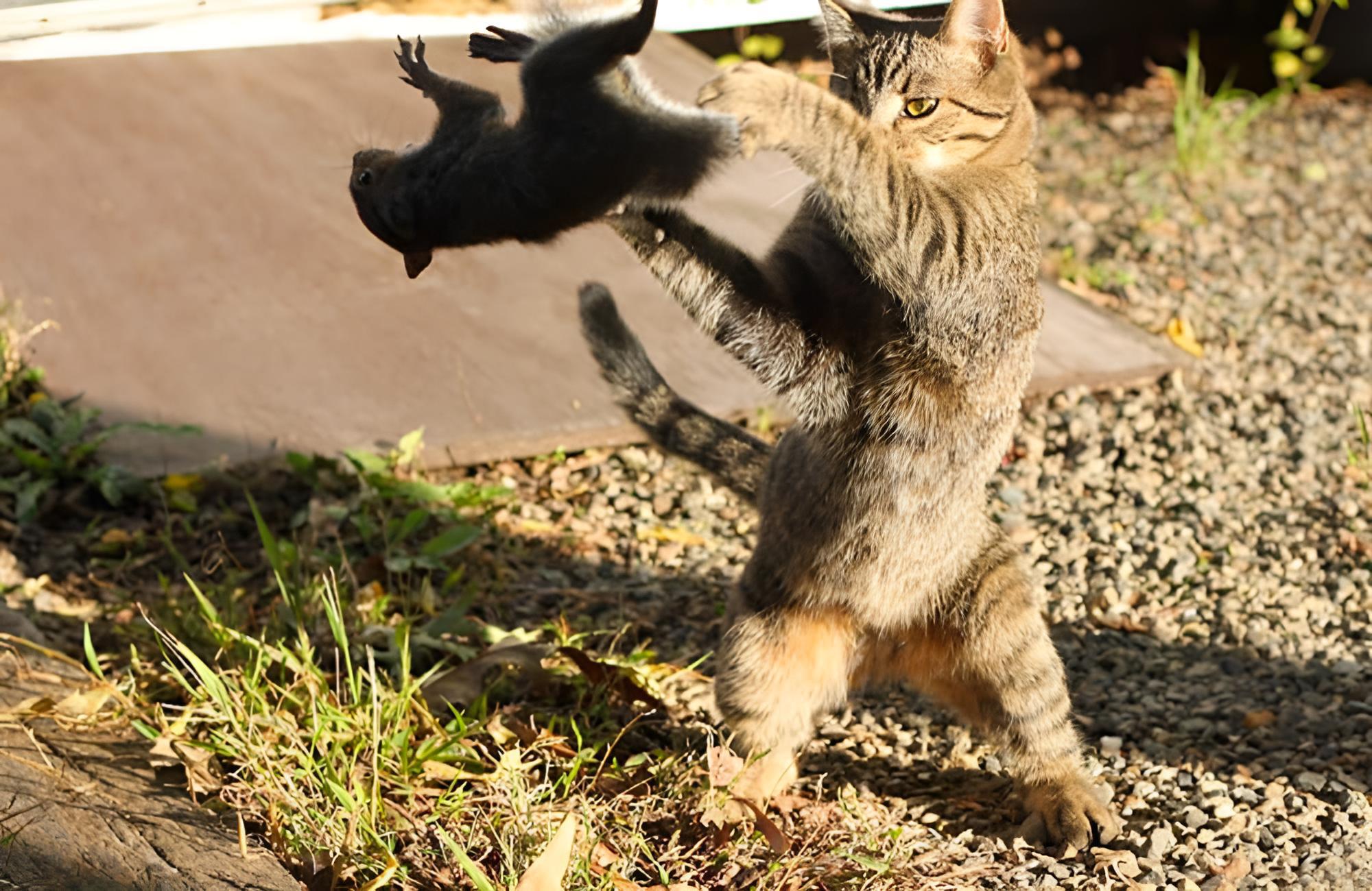 The photographer who captured this image must be given an award, for they managed to capture the essence of how cats act. An angry little cat can be seen throwing a squirrel out of its way, but we do not know the exact reason behind this outburst. The squirrel may have just committed the sin of coming in the cat’s way!