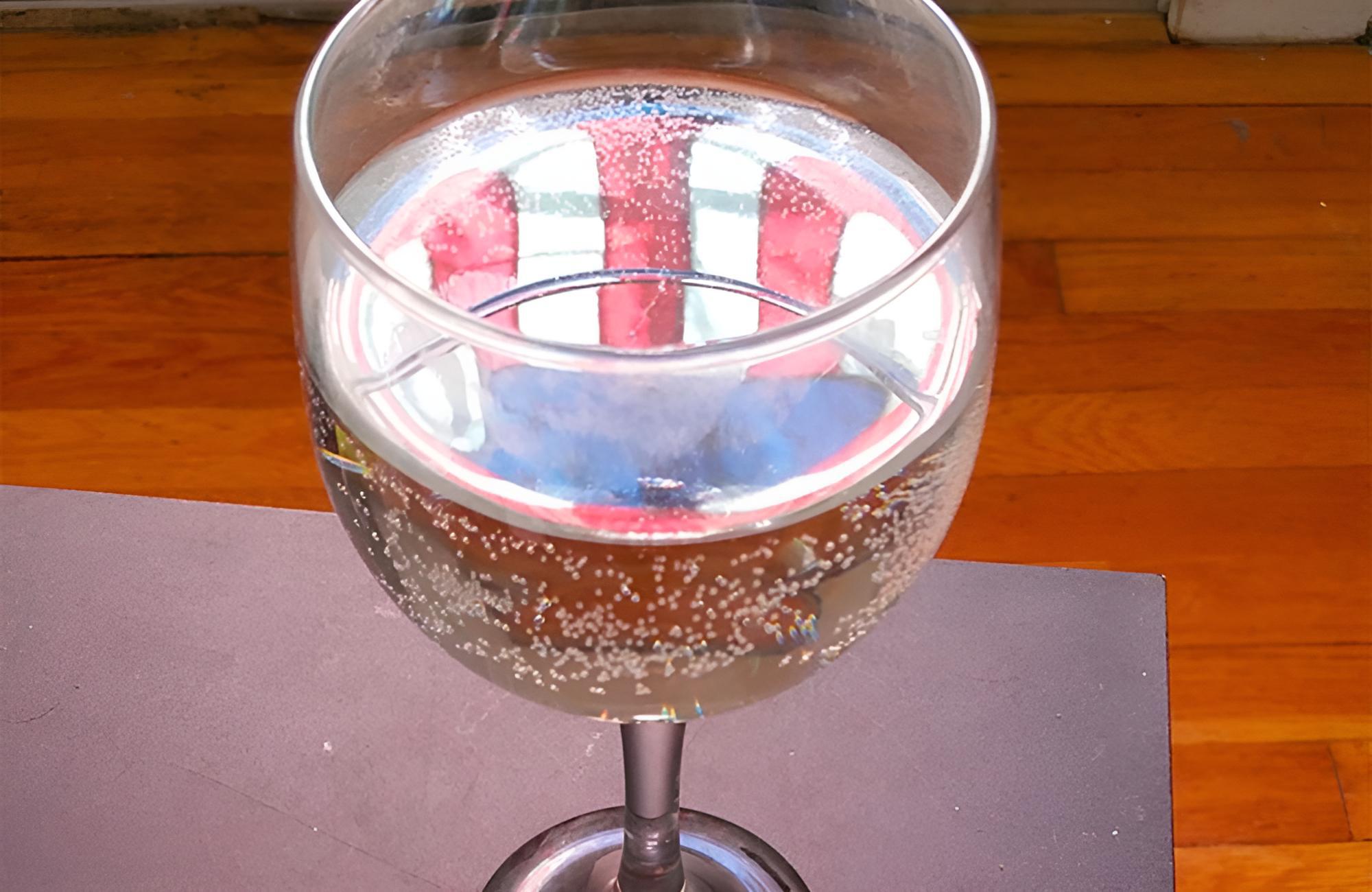 Talking about rainbow reflections, let’s take a look at this perfectly timed and angled picture that features the flag of the United States but with a twist. We can see a glass of sparkling water or a fizzy drink sitting atop a counter right in front of a window bearing the US flag.