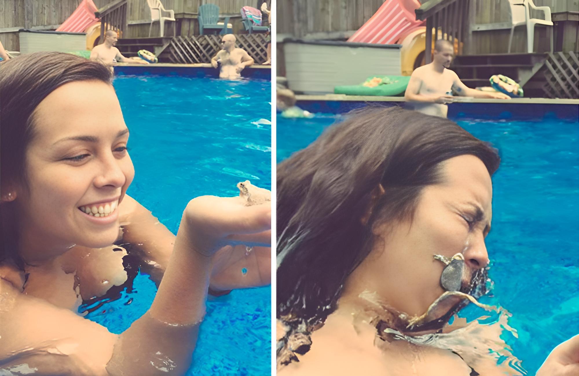 This perfectly timed picture features a girl trying to do the exact same thing, but the whole ordeal backfires on her. She is initially very pleased to see the frog jumping around in the pool and manages to pick it up in her hand. But her happiness is short-lived as he jumps on her face and sticks to it! Talk about a Disney movie gone horribly wrong!