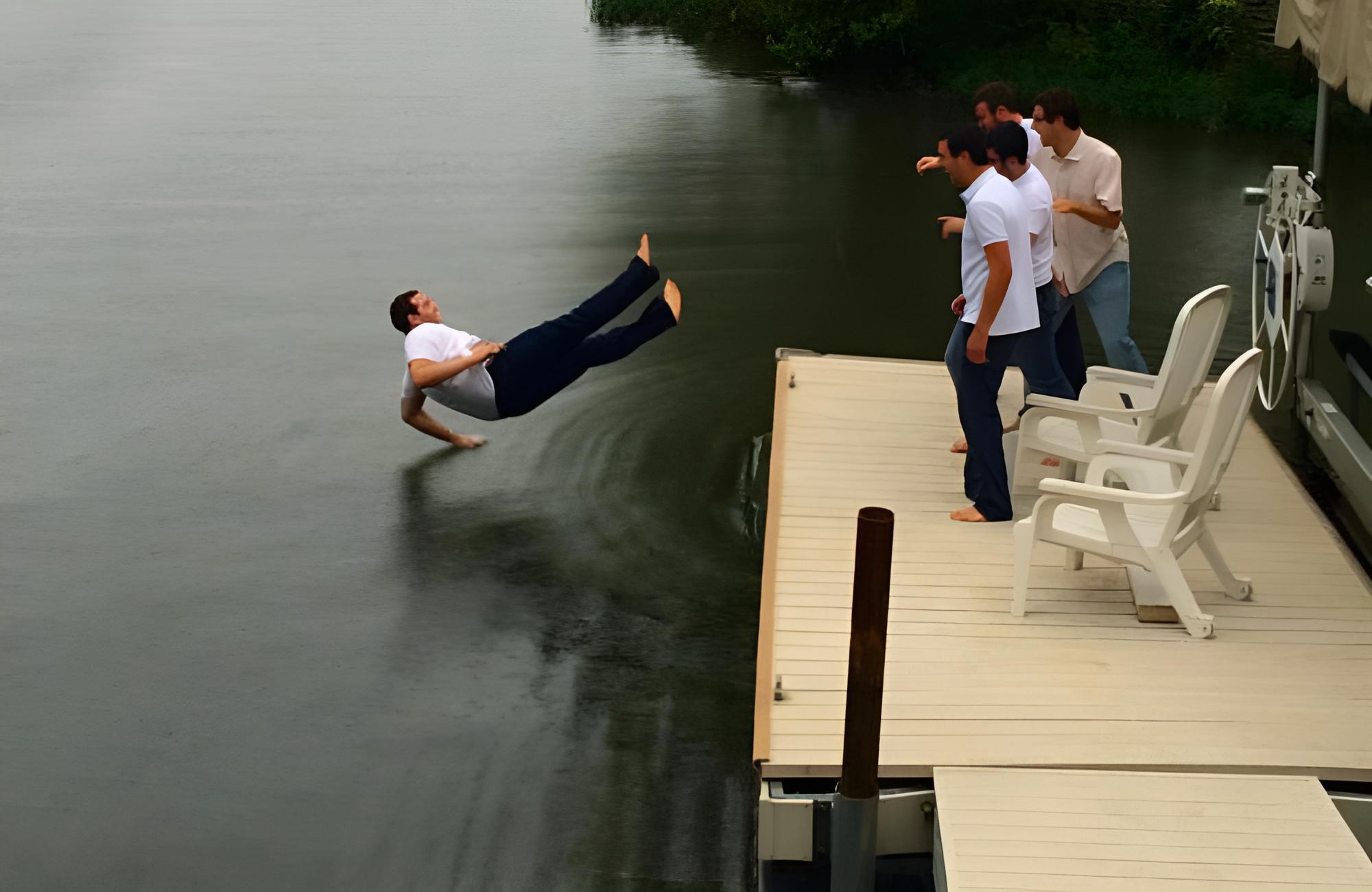 Put four friends together in a place surrounded by water, and one is bound to throw the other into it. A similar situation is unfolding in this picture, where a group of friends are having the absolute time of their lives by pushing one of their peers into the water.