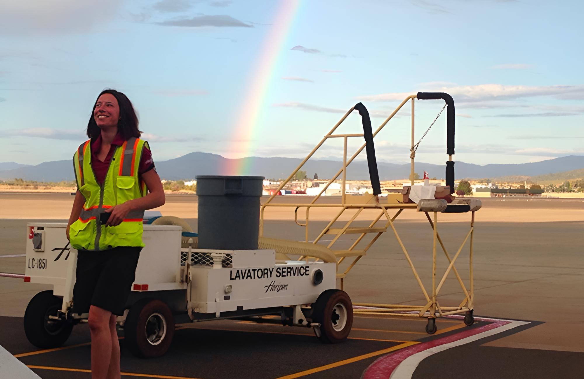This image was probably captured on an airport runway and shows us the disappointing truth about where rainbows end. A lavatory service moving slab! This is the one perfectly timed photo we do not wish to believe in because how can something so magnificent as a rainbow end like this?