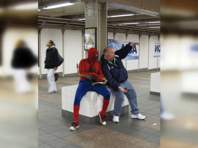 Spider-Man is not having it. He makes money from saxaphone playing. In an unexpected turn of events for the superhero story, this scene catches a time where even Marvel’s cherished web-slinger must adjust to financial reality. Seeing Spider-Man playing a saxaphone instead of firing webs offers a funny yet somewhat moving reflection on contemporary life. Combining pop culture, music, and comedy, this imaginative street performance turns a regular subway ride into an amazing show. The juxtaposition of a superhero busking emphasises the universal character of financial hardships and gives the daily commute some whimsical touch.