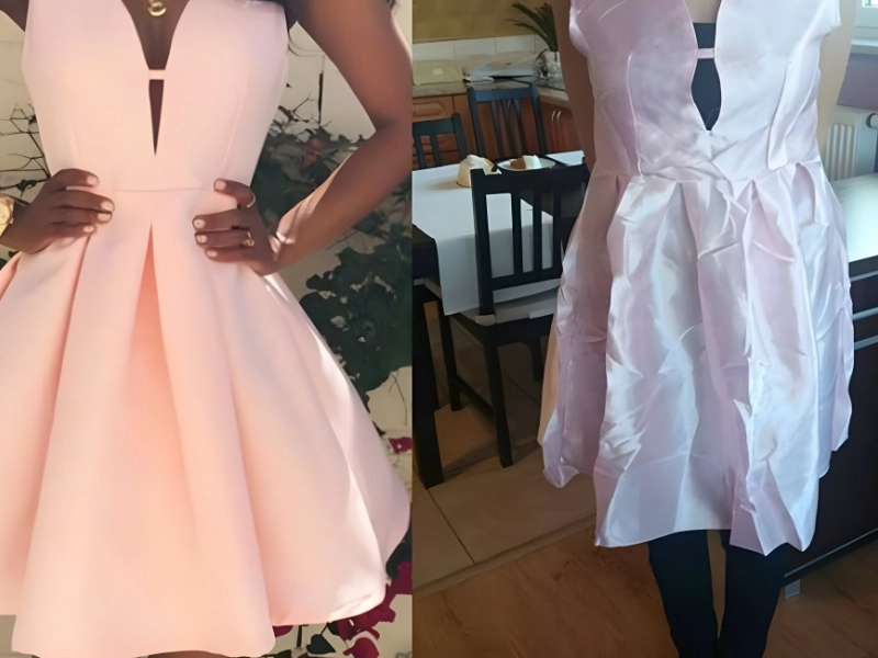 We’ve seen a lot of awful dresses, from prom gowns to bridal disasters, but this one just might take the cake. The original image depicts a thick, well-made mini dress in a lovely shade of peach pink with trendy keyhole cutout details.